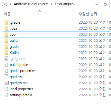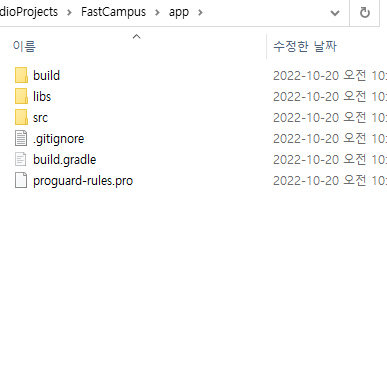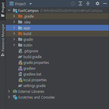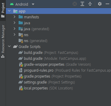 • 안드로이드 스튜디오의 프로젝트 뷰는 설정에 따라 프로젝트 구조를 다르게 보여주는데, 설정을 바꾸면 실제 구조가 바뀌는 것이 아닌 보이는 것만 사용자가 보기 편하게 바꿔주는 것이다. 주로 자주 쓰는 설정은 Project와 Android 두 가지이다.