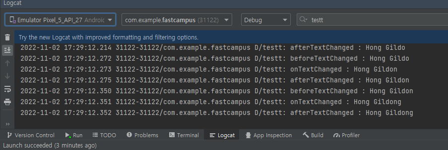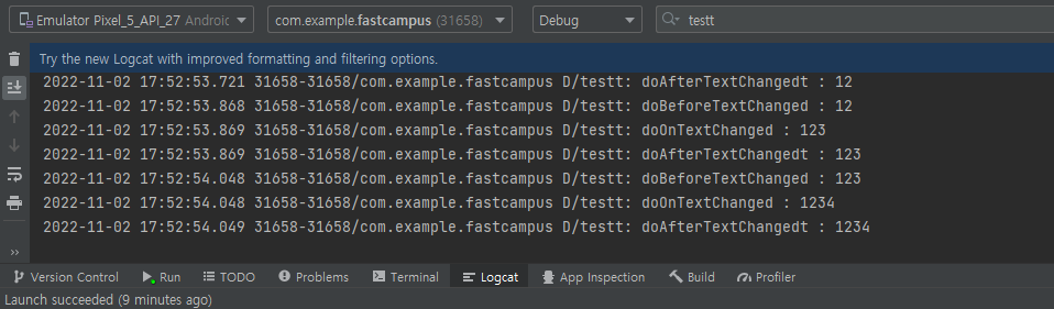 • EditText의 doBeforeTextChanged, doOnTextChanged, doAfterTextChanged 메소드 사용.