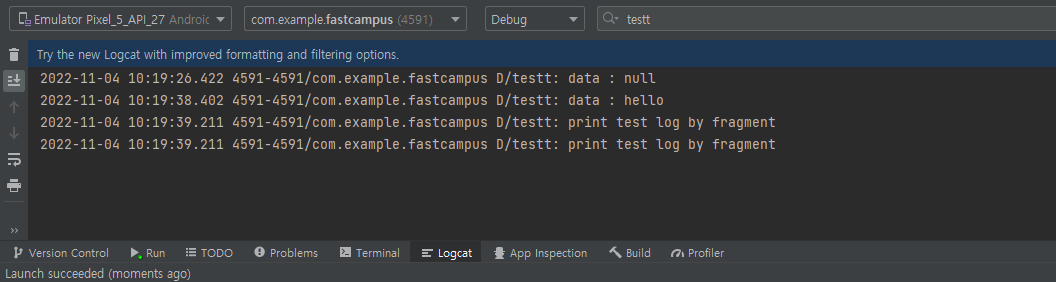 - xml로 포함시킨 프래그먼트에서 나온 로그와 코틀린 프로그래밍으로 포함시킨 프래그먼트에서 나온 로그 모두 잘 출력된 모습.
