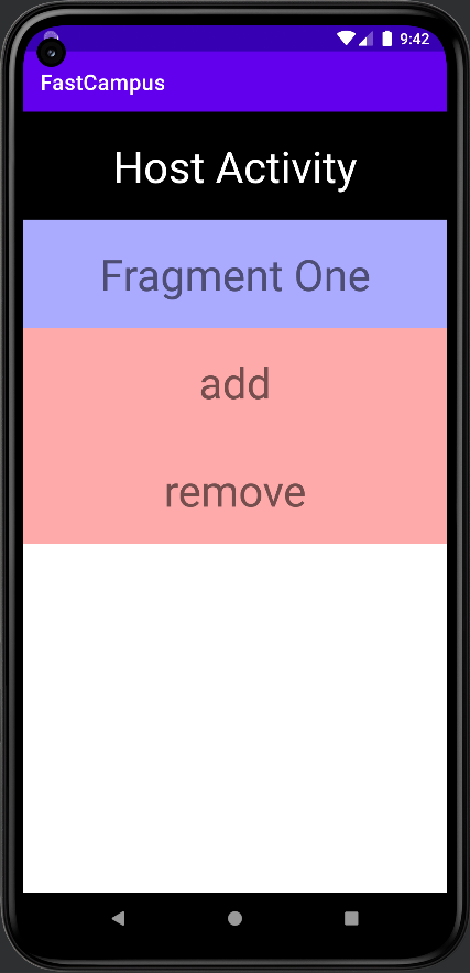 * 코틀린 프로그래밍으로 포함시킨 프래그먼트의 로그를 띄우기 위해선 add를 눌러 프래그먼트를 추가해줘야 한다.