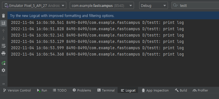 Log.d("testt", "print log") // Logcat에 print log 출력