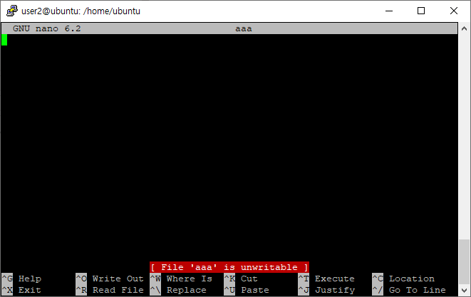 • aaa 파일의 소유자인 ubuntu와 소유자가 아닌 user2 계정의 파일 수정 비교