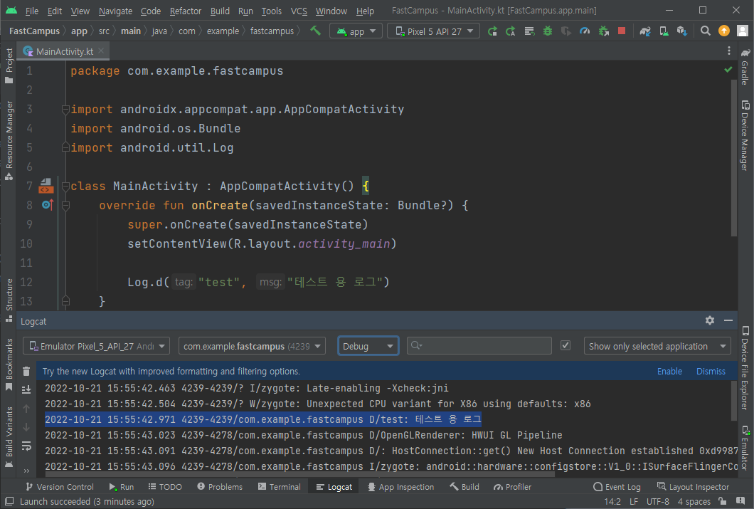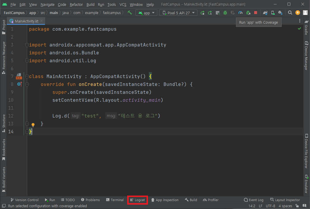 • 안드로이드 스튜디오 Logcat에서 기록된 로그를 볼 수 있다.